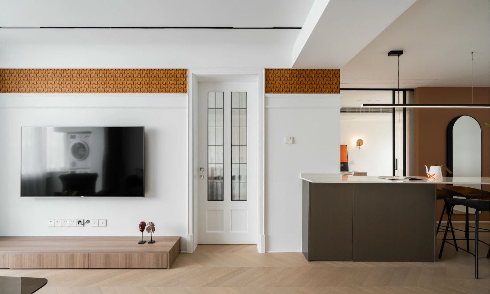 对面电视背景墙的橙色羽毛壁纸 成为客厅无比亮眼的点缀, 来自非洲陶瓷艺术品牌- cloe-son的阿德莫尔联名系列。