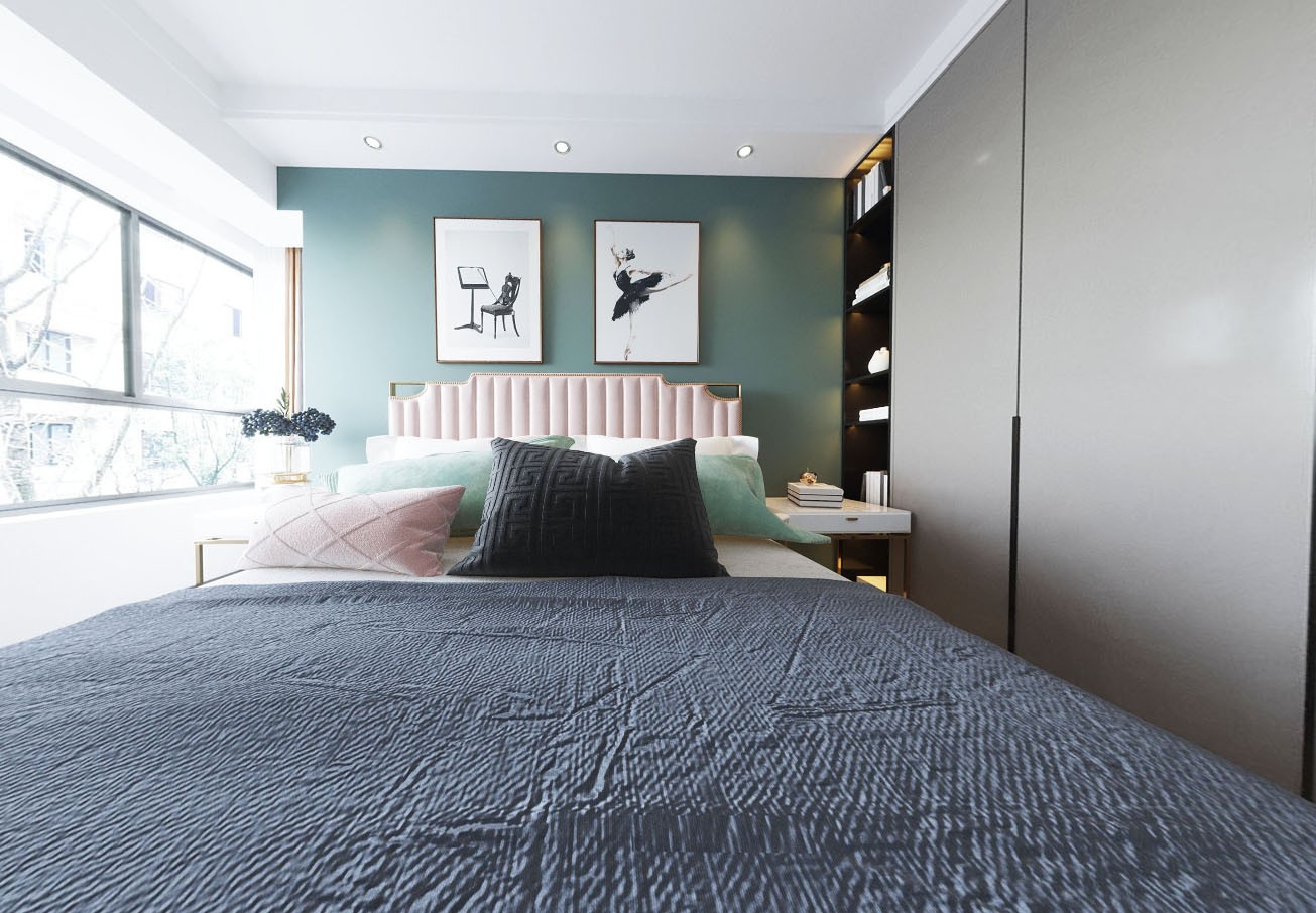 床头背景墙侧简单边吊,不开主灯情况下。筒灯采光,舒适宁静