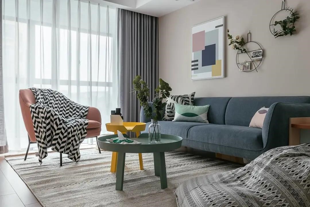 浅灰色的窗帘,黑白相间的毯子及地毯,三者之间有了很好的呼应,为了避免单调乏味,所以特意选了蓝色的沙发,黄色及绿色的茶几等,因为有了这些颜色的加入,空间立刻变得活跃起来。