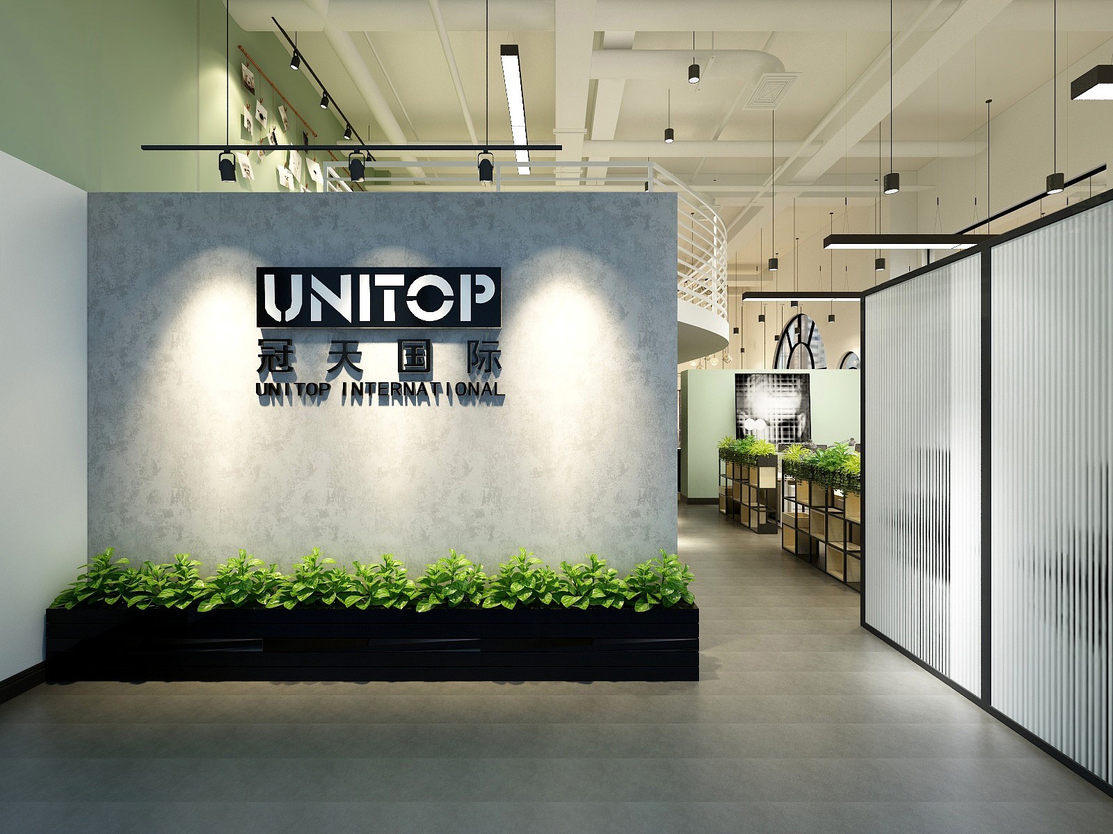 该视角左侧为拱形的参观入口,入口左侧为茶水区,右侧为产品展示区。该区域设有茶水台、吧台、艺术吊灯来营造轻松的氛围。茶水区与产品展示区相邻,它与开放办公区仅一墙之隔,满足客户和员工对茶水的需求。