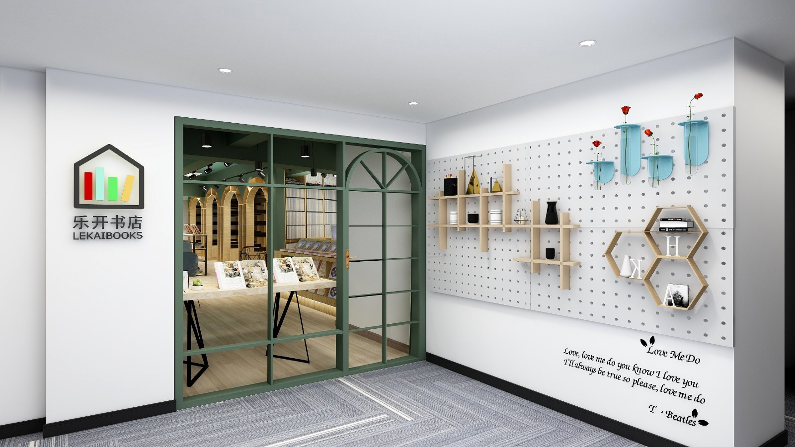 门厅层高有限,大概二米二。所以我们书店的大门采用玻璃的材质来弥补层高低产生压抑的缺陷。为了不使大面积的玻璃单调采用了金属分割线的方法,让大门丰富而不繁琐。门框也采用墨绿色,与我们室内的色调相呼应。左边是书店的LOGO,右侧墙面是书店室外的展示墙。