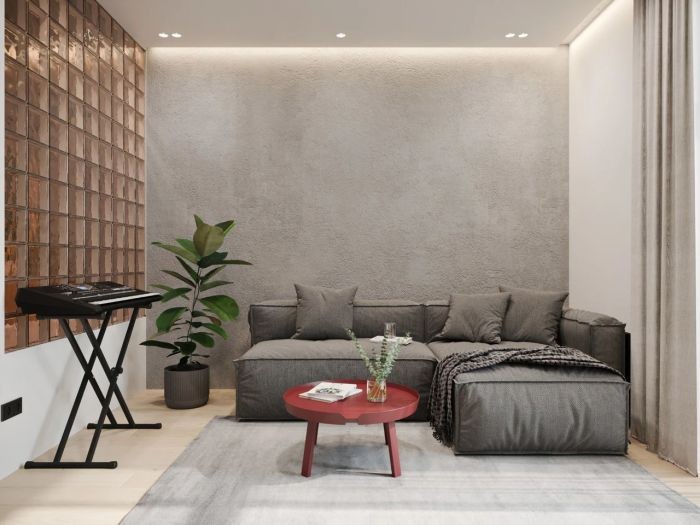 一整面混凝土墙给整个狭隘的空间创造出一丝凉爽感,一座同色系的L形沙发安放其中,搭配红色的圆形茶几形成了整个空间一道抢眼的风景线。