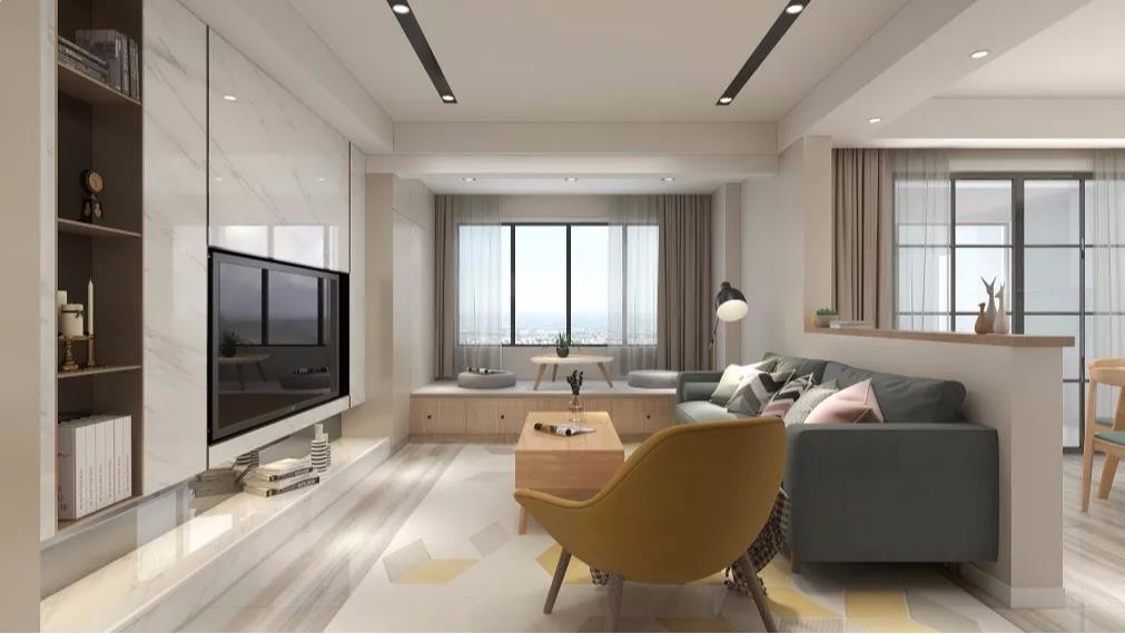 客厅区域设计,现代风结合原木系,黄蓝色系搭配,简约温馨同时具有设计感。