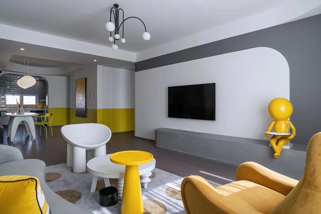 灰白结合的电视墙,打破常规设计,户型与地台结合,造型简约视觉不呆板。