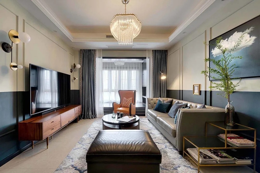 客厅,独特的造型与配色,让空间显得成熟优雅而又华丽。墙面都加入了边框造型,并且墙脚深蓝+墙身奶白的拼色设计,也增加了空间的深色与立体感。