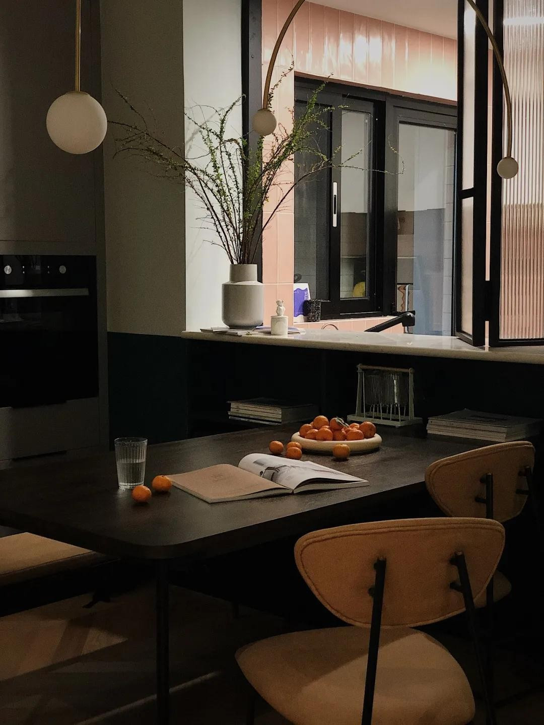 餐区客厅和厨房的互动和关联,选用黑色边框和长虹玻璃,可以***地把客餐厅的自然光引进厨房。