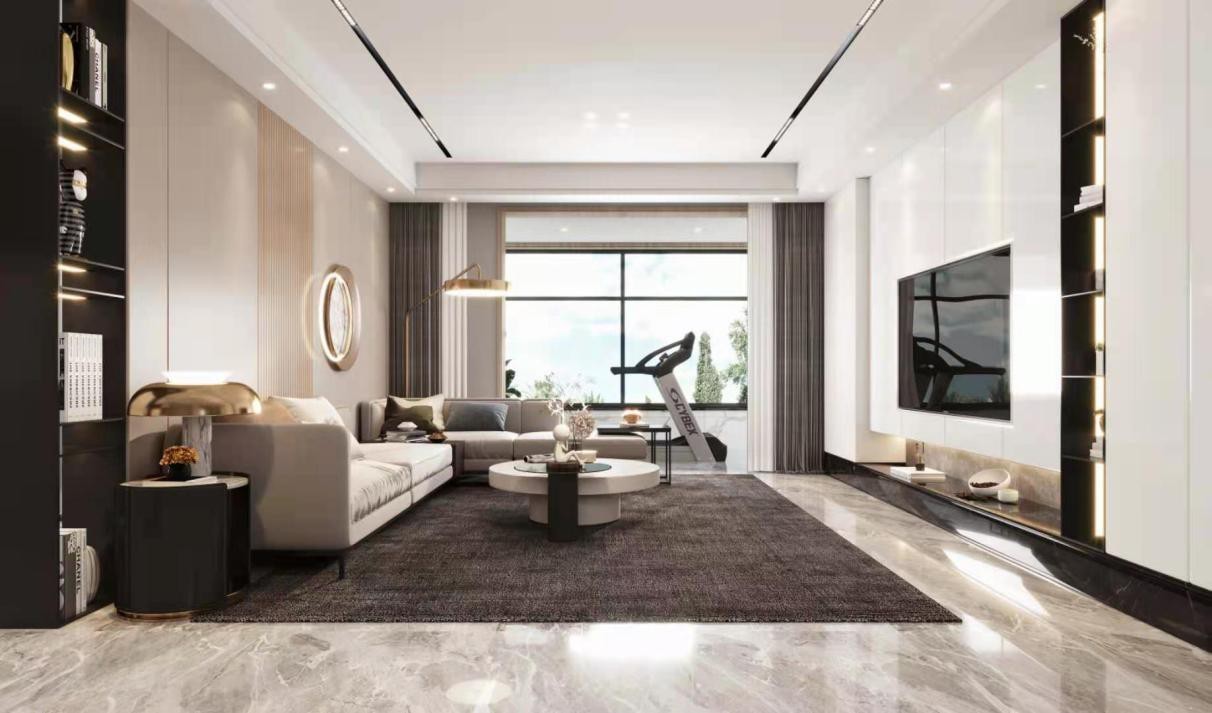 客厅采用电视高贵,提升储物空间,整体使用暖白色系,搭配设计感的家具以及浅灰色色地砖。