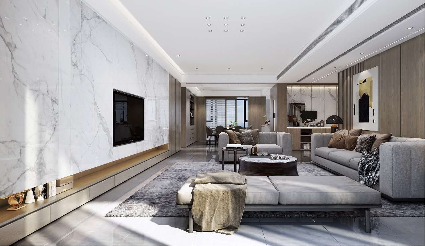 沙发背后的木饰面,在墙面分割出不同尺寸的几何轮廓,且线条设计降低了整块带来的压抑感,更显轻盈。电视白色背景清新、淡雅,天生自带***感,与客厅整体氛围统一和谐。