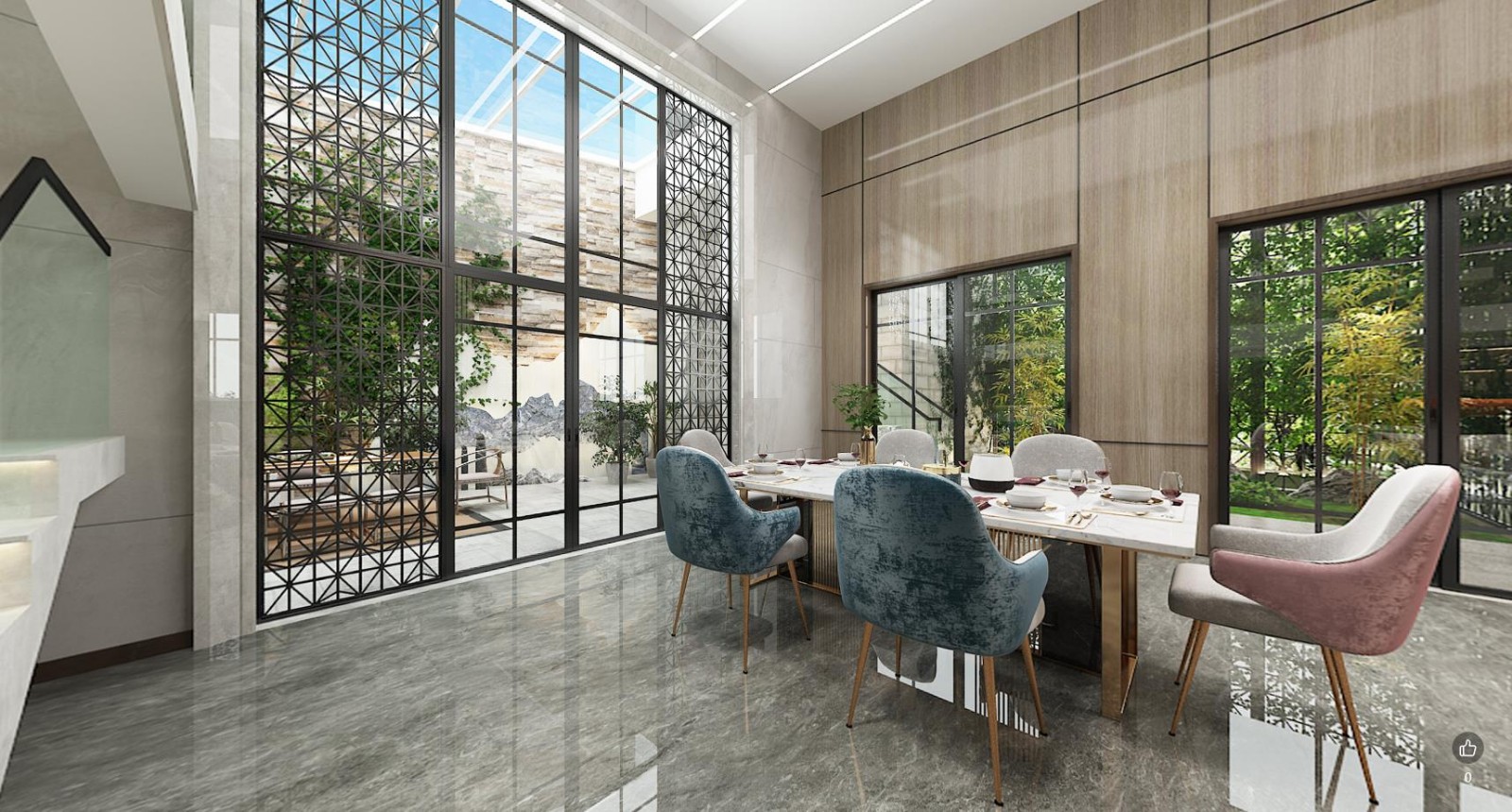 三层洋房底复,南北通透,环境优美.地下室是挑高层,所以又搭建一块夹层功能区域.每层的功能区域比较明确.一楼为会客户功能,二楼以睡眠静区;地下室夹层为书房及储藏功能区,地下室为起居生活区,厨房餐厅在地下室,空间大采光也很好.主要地下室***优势可以打通出去,有个自然院子.整体方案设计有挑战性,满足客户功能要求为前提,把效果做到了***.