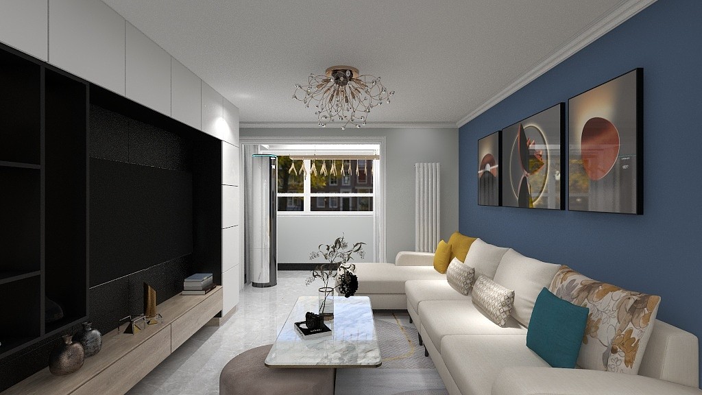 从玄关进来之后就是开放式的餐厅和客厅了,沙发背景墙上刷的蓝灰色乳胶漆,简约又显得很有活力。搭配浅黄色的布艺沙发,白色茶几,简约又很清新,满满的北欧风。