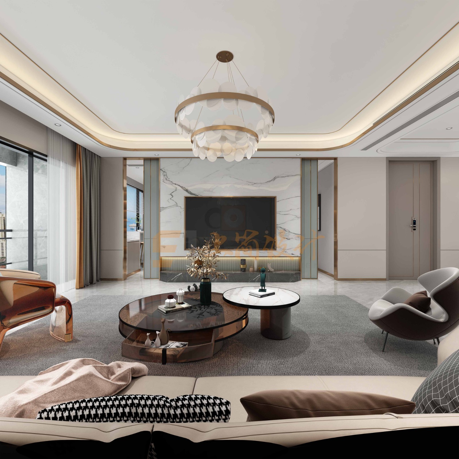 客厅现代华贵的空间,圆弧形吊顶天花以金属包边,使整个空间轻奢而又上档次。客厅与茶室相通,在电视背景的位置两边打通设置推拉门,让空间出入更加便捷和富有情趣。