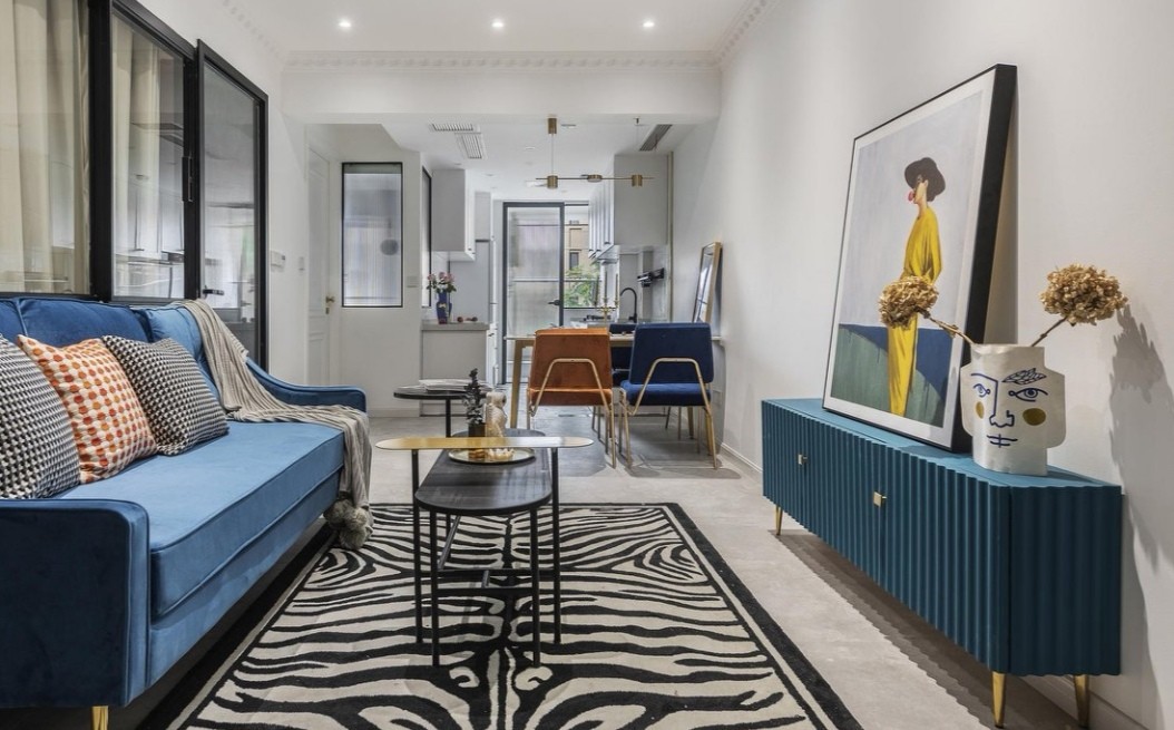 沙发后的玻璃门窗让空间通透,宝蓝色沙发鲜艳明快