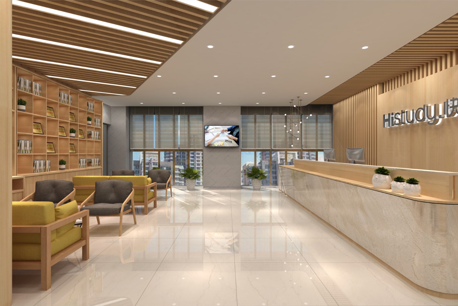 整个色调以木纹色为主,前台采用石材与木头结合,削弱了石材冰冷的感觉,给人予亲近感。