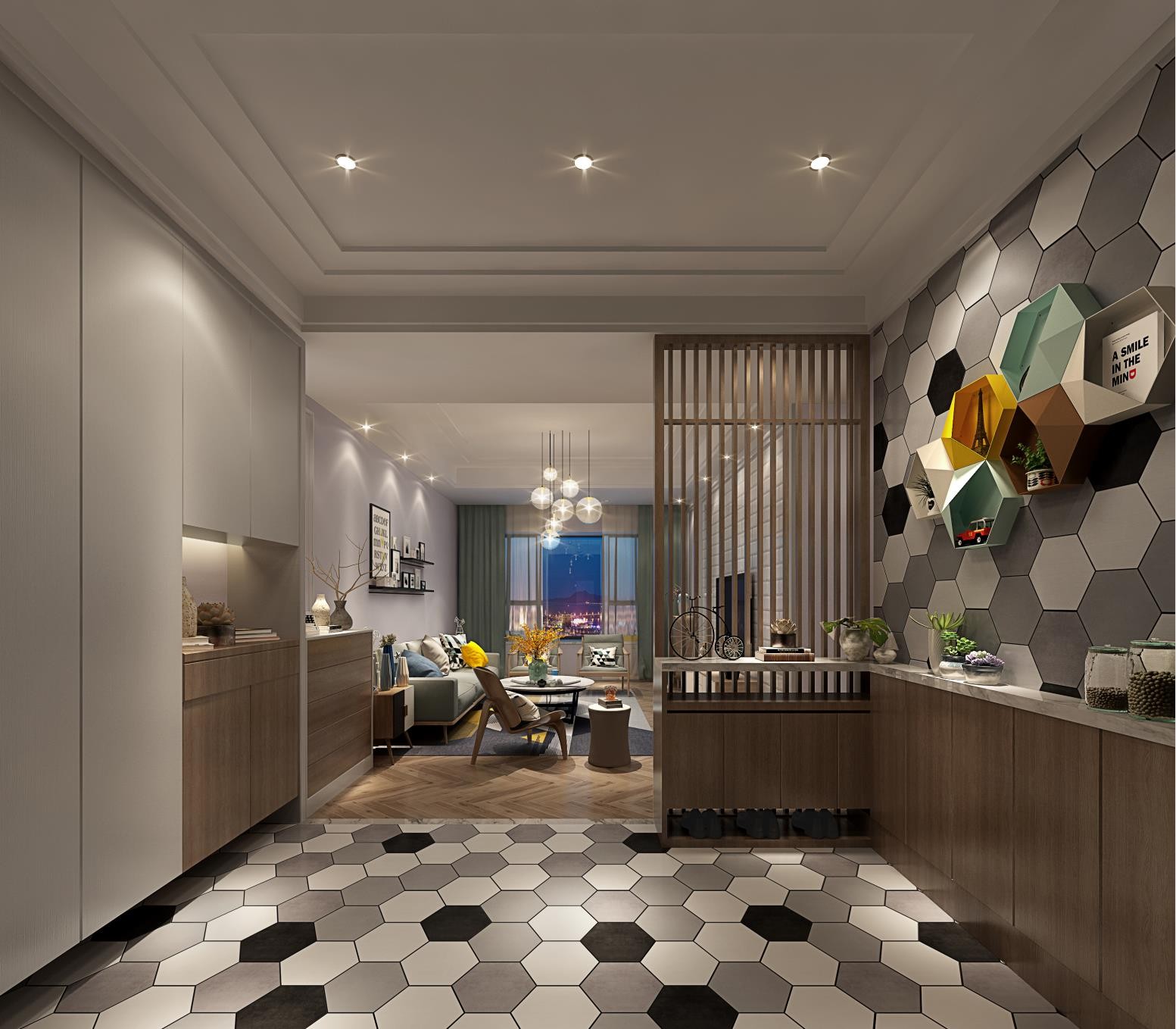 玄关隔尔不透,若隐若现,地面一直到墙面,采用了黑白灰三色六边形砖搭配,真个空间让人眼前一亮。