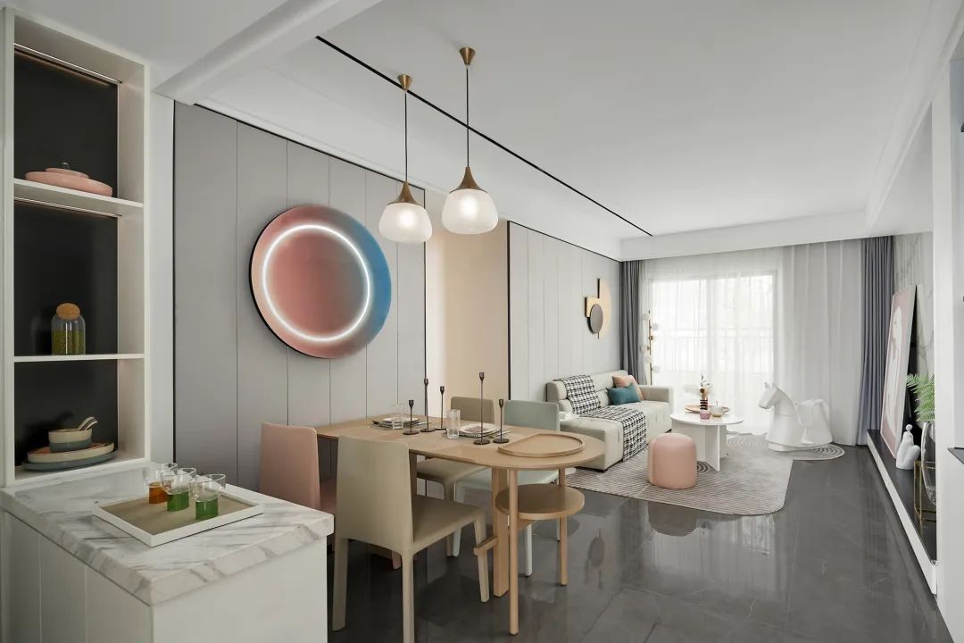 在居住空间里,餐厨区是***烟火气的地方。以独具特色的粉蓝色装饰灯点缀,让用餐也变得妙趣横生。