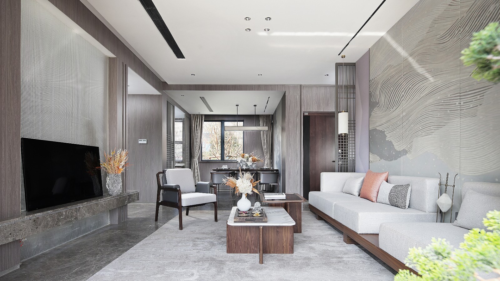 将中式元素与现代材质巧妙兼柔,铸就现代的东方之美 ,营造出如水墨画般朦胧的诗意美。隔绝一切喧嚣杂念,回归最真实的恬淡心境。