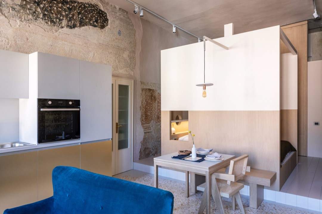 一座惹眼的蓝色绒面沙发 与旁边充满历史感的斑驳墙面形成材质对比