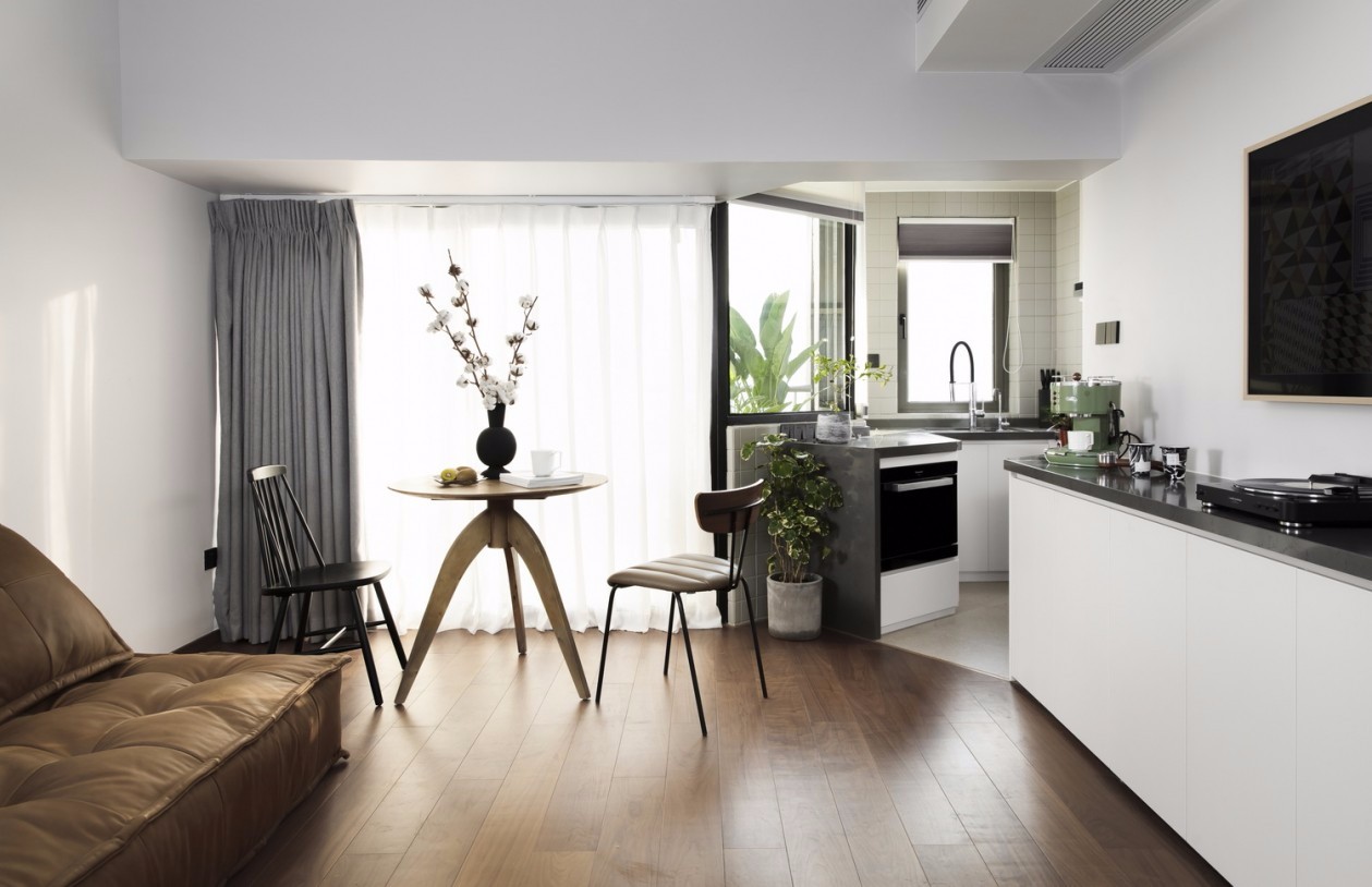 整个空间的表达 延续现代简洁通透的设计语言 在干净的空间里 用胡桃木色的木地板做基调 与北欧表情的焦糖色沙发相得益彰 形成一个温暖、有情调的空间