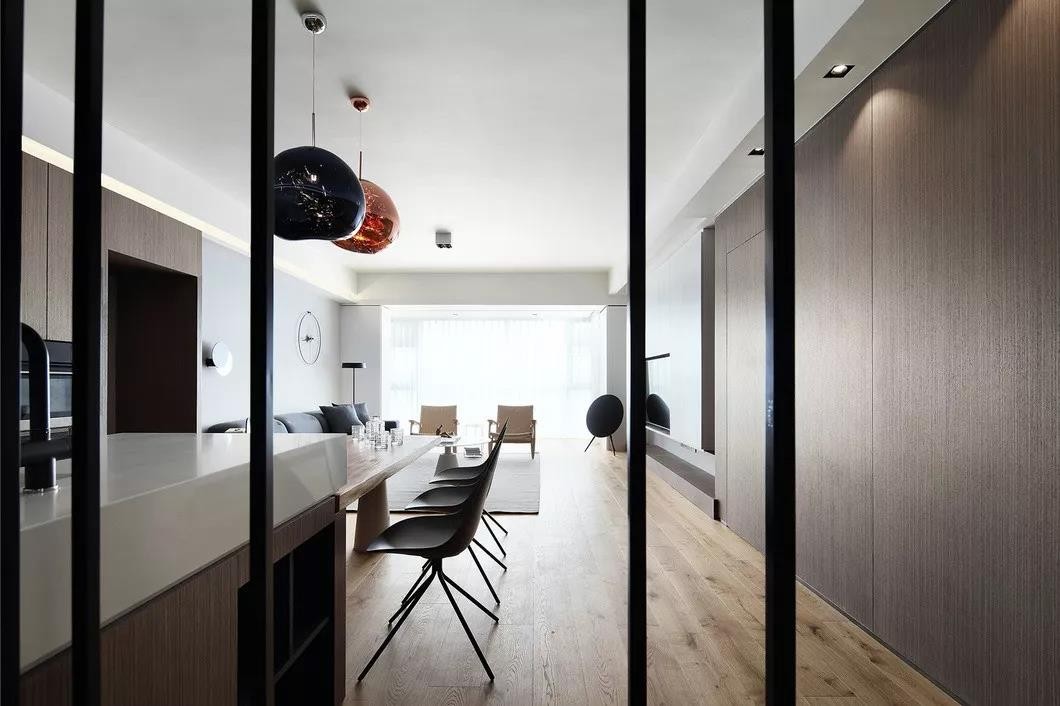 入户正对客餐厅,用黑色铁制廊栅做玄关,在半遮半掩的同时增加装饰效果,黑色铁制廊栅做成了推拉门的形式,看上去是推拉门,实际是固定的屏风。没有复杂的装饰和色彩,简洁清新而又时尚感十足。