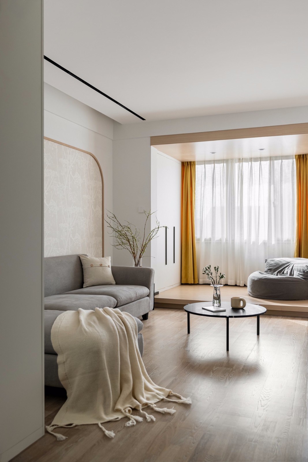 厅采用无主灯设计,光源分散,让家更有氛围感. 整体色调以白色为主,点缀自然木色与灰色,窗帘的一抹黄色作为整个空间的跳色,干净素雅的同时更加灵动。
