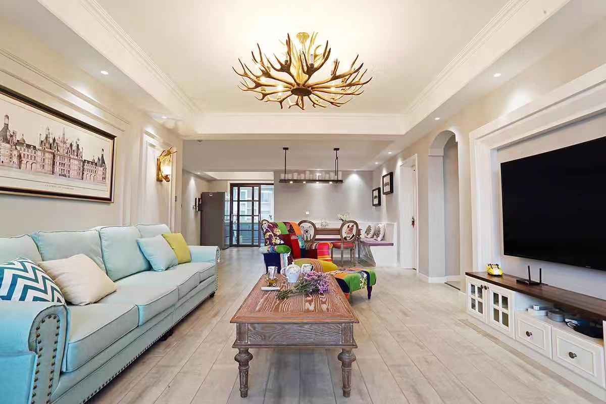 沙发背景采用实木线条装饰,电视背景做了个美式的简洁壁炉,主色调为暖灰色,配上美式的家具,整个空间更加温馨。