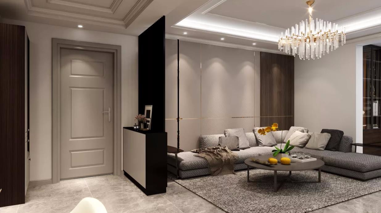 客厅沙发选用了米白色 与白色大理石的茶几和亚麻灰的地毯 形成统一和谐的色调