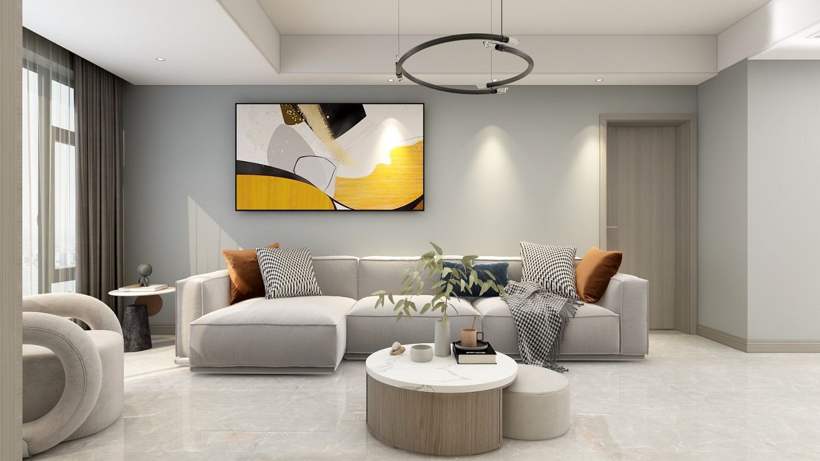 客厅采用明亮的银灰色为主基调,进一步放大宽阔感