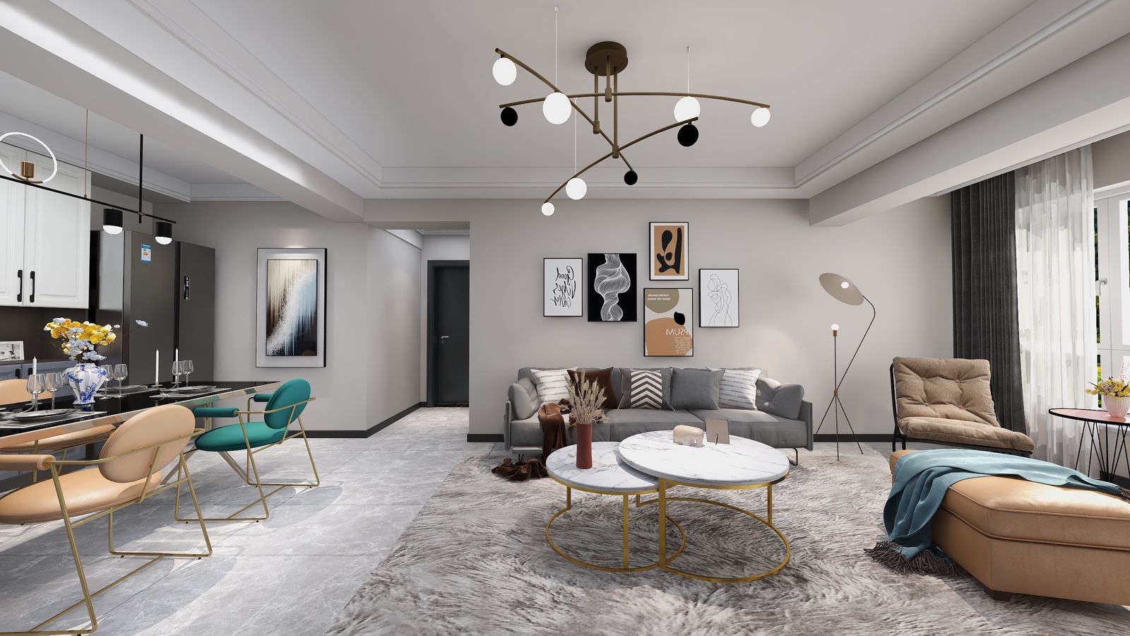 整体墙面是中灰色,沙发背景墙没有造型,以简单的装饰画为主,在电视背景墙是上设计了石膏线造型,线框里用壁纸调色活跃空间氛围