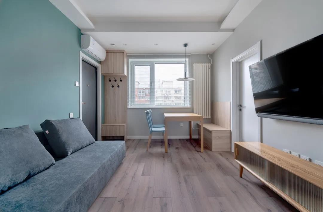 将吊柜与底柜之间的背板上安装几处挂钩,便于进出门拿取衣物,非常实用。经过重新规划将餐厅位置安置在客厅角落,卡座餐桌既增加了储物空间又节省使用面积。
