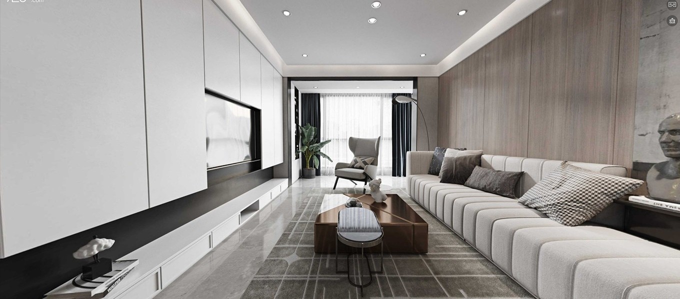定制柜体作电视墙,中间镂空,辅以软装点缀打造空间层次感、