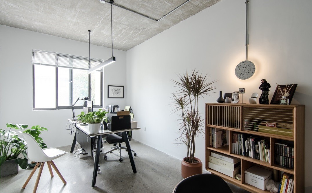 裸露的水泥色顶面,白色乳胶漆墙面,看似不协调,却又相得益彰。