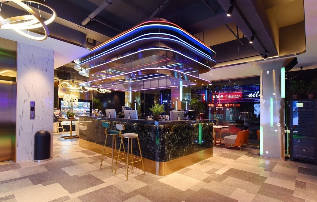 打破传统酒店布局,在紧凑的空间中,设计将前台与酒吧台融合一体,将大堂,大堂吧,全日餐厅与行政酒廊空间功能叠加复合,满足顾客各项体验功能,提升配套空间的使用频效,大大降低运营成本,同时营造出一个带有社交属性,颜值与舒适并存的酒店空间。因为原是经济型酒店,房间格局都是较小的,因此我们把一层公区功能性配套设计的更为完善,客房内仅留下睡眠功能,让其他行为活动全部在一层公区实现,在这里可以下午茶,饮酒,听歌