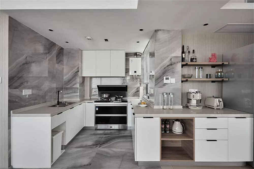 厨房做了开放式的布局,通铺灰色系的大理石瓷砖,搭配白色系的橱柜,大理石瓷砖的独特纹理非常帅气,整个厨房显得格外的宽敞、明亮。