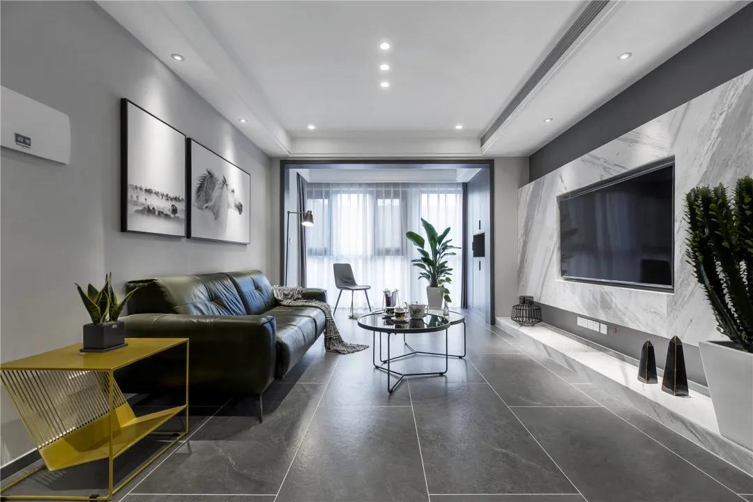 ▲电视墙以大理石地台与电视墙的设计,摆上仙人掌的装饰,在灰色地面砖的空间下,布置黑白配的茶几,让空间显得格外的时尚优雅而***。