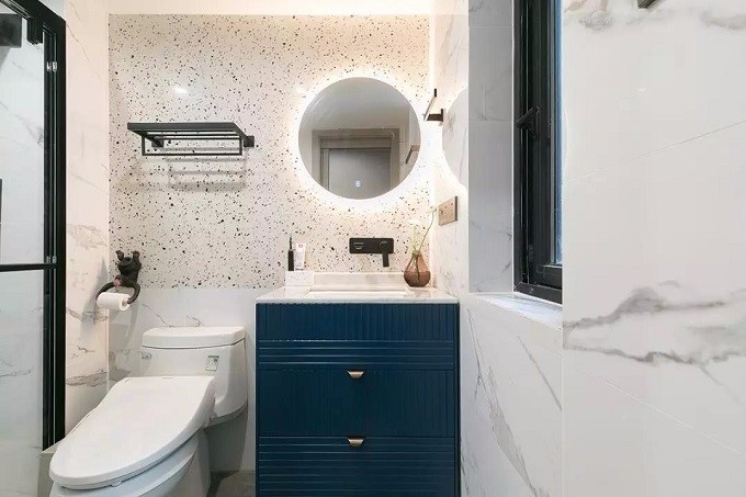 水磨石背景、白色大理石纹理瓷砖、蓝色的卫浴柜,还有那会发光的镜子,让小小的卫浴空间也是质感与颜值兼具。