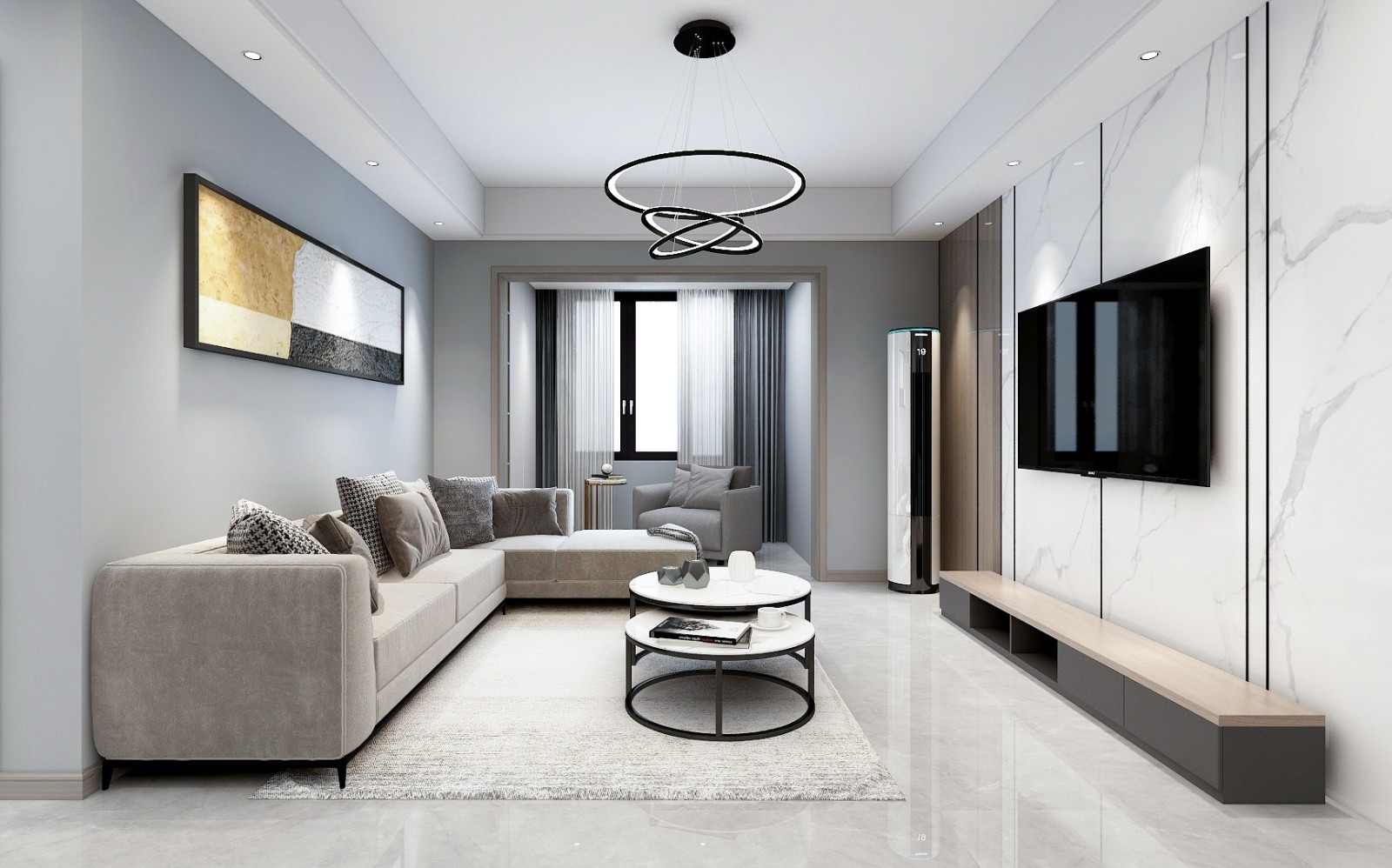 电视柜背景墙采用木饰面及大理石相拼接的效果,简单的造型使空间层次感增强。