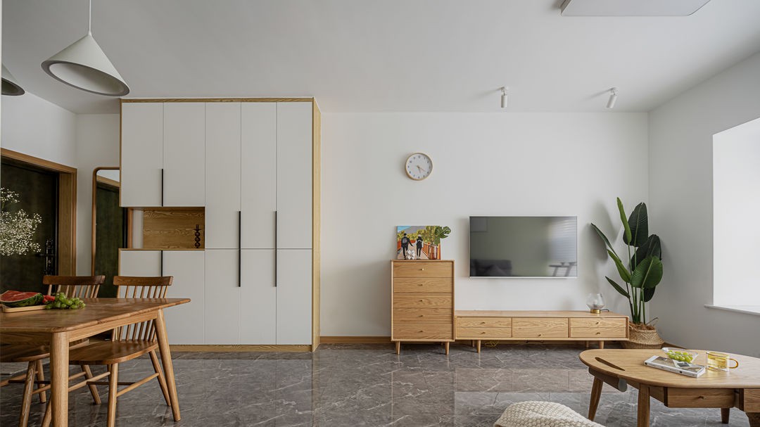 餐厅后面是公共卫生间,公卫的干湿分区处理,满足了同时淋浴或者洗手功能. 正对书房推拉门出来的墙上做了小装饰,避出迎面即墙的拥堵感,同时营造入眼即景的氛围.