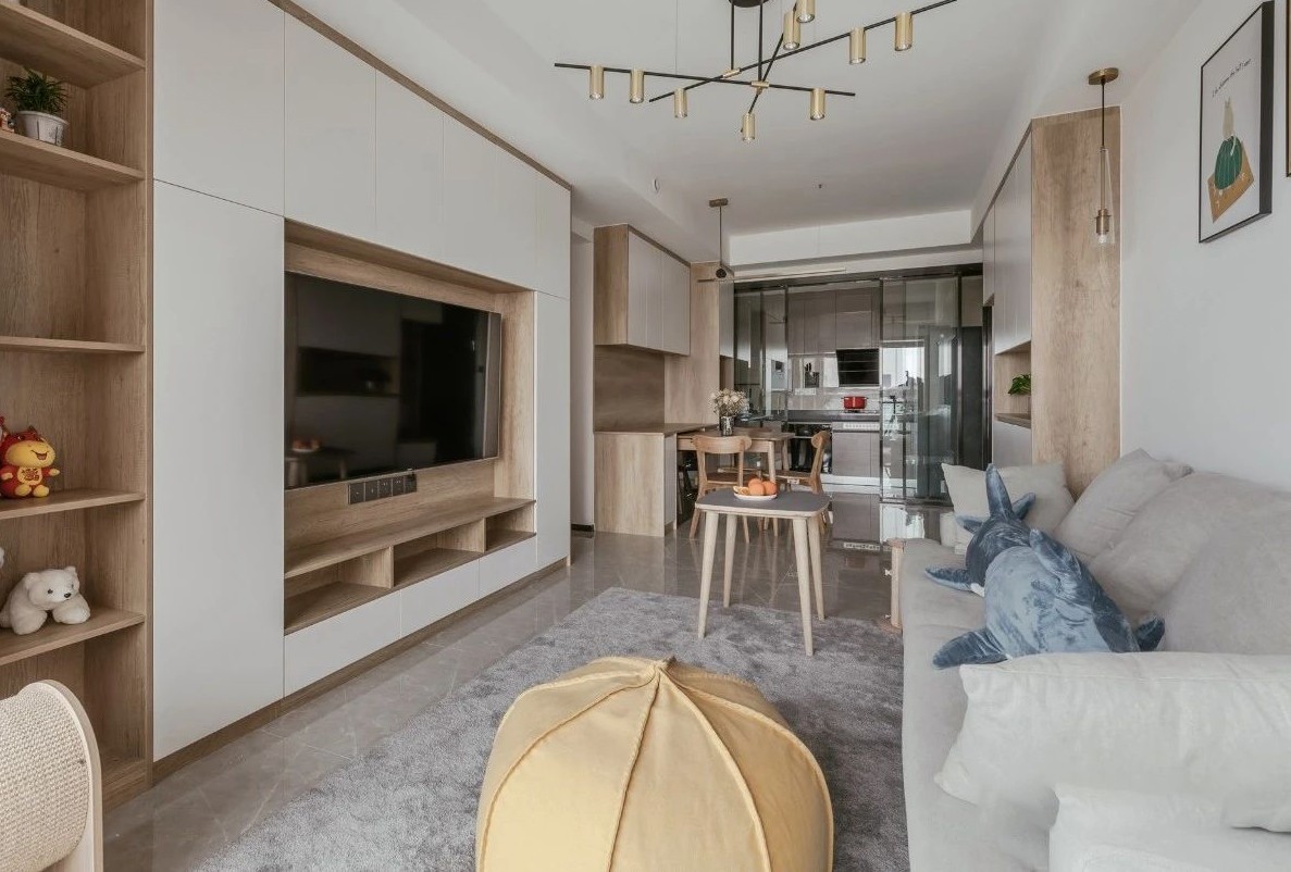 电视墙做了满墙定制柜,封闭的柜子采用白色柜门,开放柜采用原木色,实用性强,视觉上也非常的自然简洁。