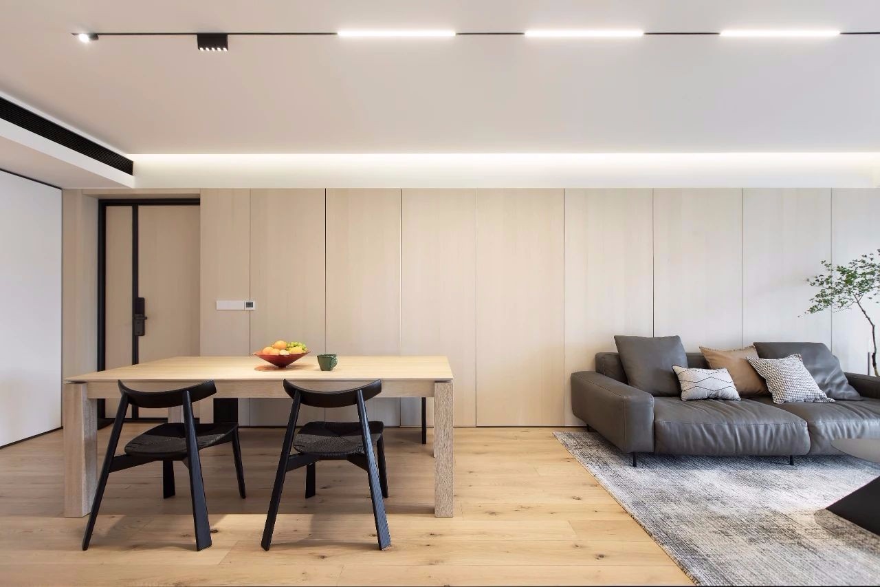 卧室去除多余的装饰,无主灯和间接照明的灯光设计配合大面积白色及木色使得卧室氛围更加柔和