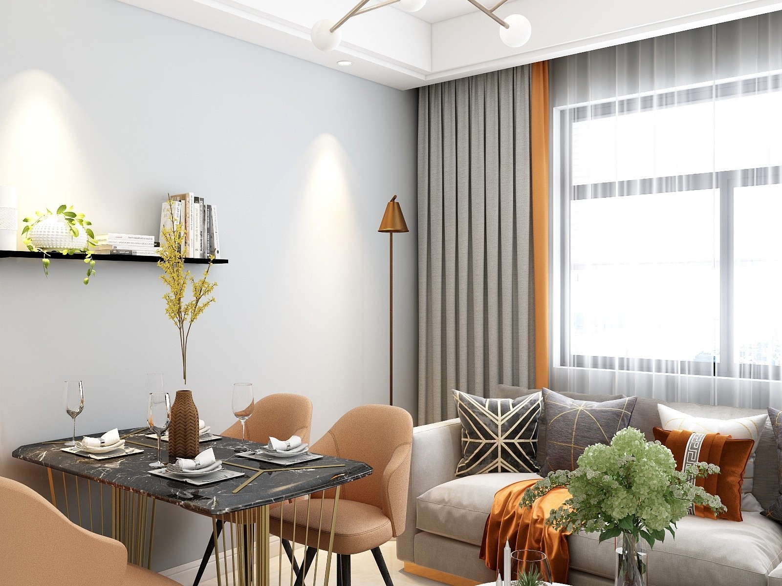 客餐厅空间较小,餐厅做了靠墙设计,业主喜欢金属质感,软装搭配了比较流行的颜色