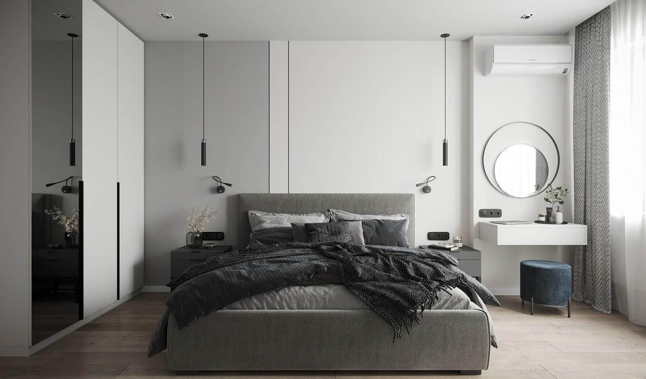 卧室背景使用灰白搭配,体现出空间感。