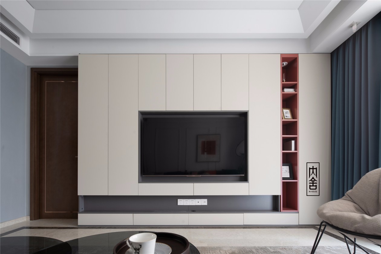 客厅整体偏绿调,墨绿色沙发靠墙放置,低调的奢华。背景墙为杏白和暗绿的拼色,色彩对比让视觉变得空旷。靠墙设电视柜,暗红色柜体点缀,有色彩的跳跃性,整体简约大