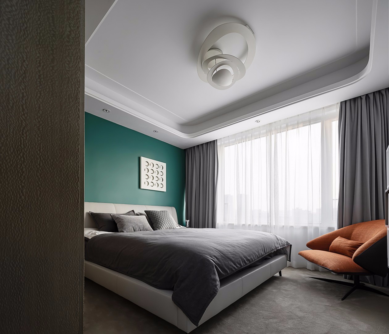 卧室是一个让人忘记喧嚣,归于宁静的空间,本不好搭配的绿色,整个空间中***感爆棚,也让整体的空间有了点睛之笔。床尾摆上女主人喜爱的橙色单椅,使卧室成了身体和灵魂的栖息地