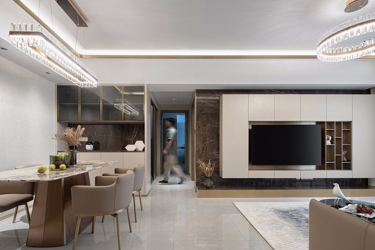 电视背景墙做了储物柜造型设计,丰富了客厅的储物空间,沉稳大气的大理石为电视背景墙铺设了一层沉稳厚重的底色,色彩和造型的搭配都十分协调。