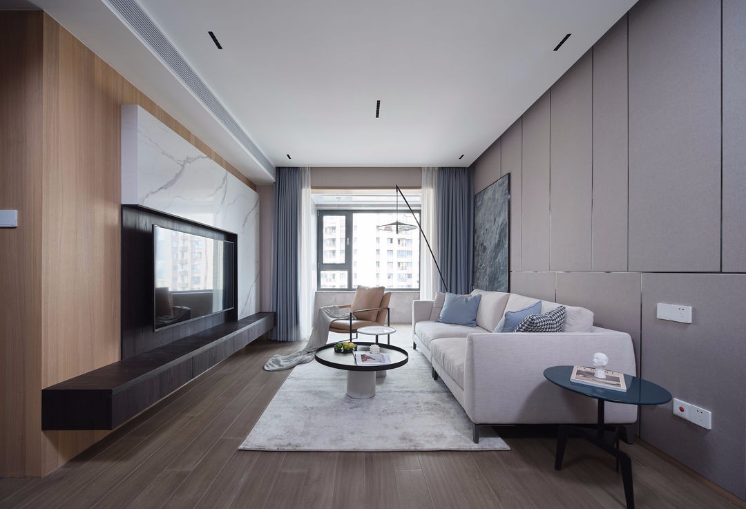 电视墙上,大理石温润如玉,原木素雅质朴,一刚一柔,碰撞出时尚优雅的气息。下侧悬空设计的电视柜更具轻盈感,与餐边柜呼应,形成视觉上的平衡也更方便后期的卫生清洁。