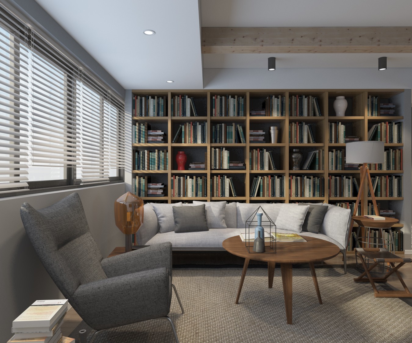 客厅沙发背景设计一排书柜,木质家具配合吊顶无主灯设计,简单又美观。
