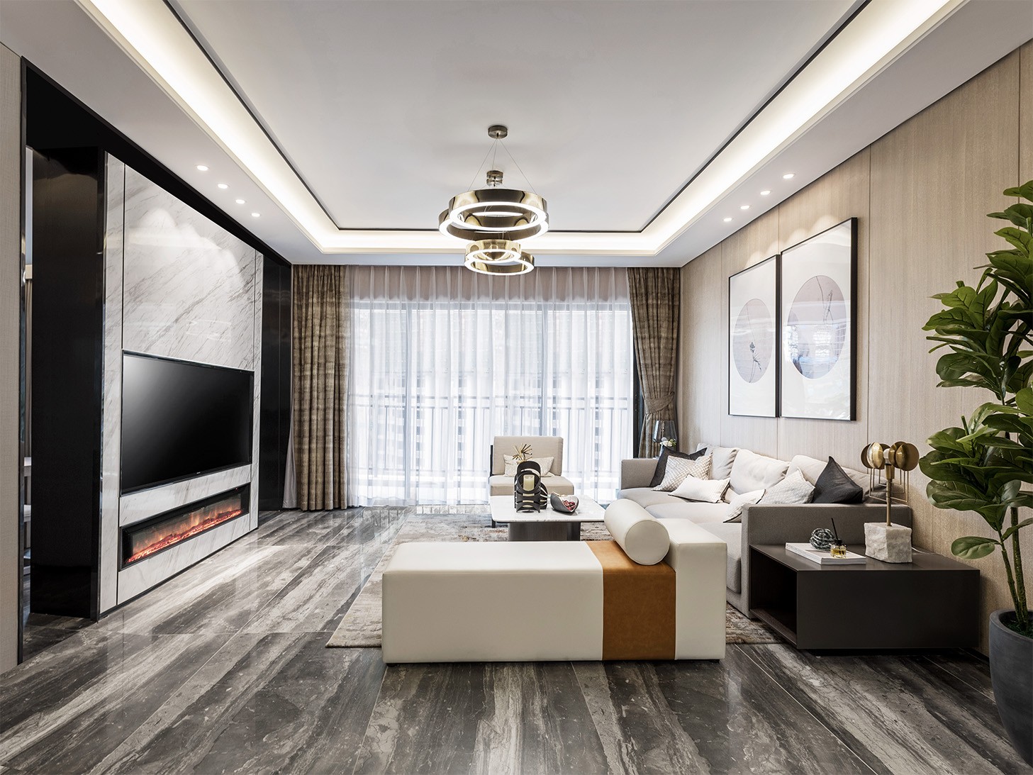 客厅活动空间地面采用的是灰色系的石材,墙面装饰以块面为主,线条点缀,做到沉稳整洁不累赘。