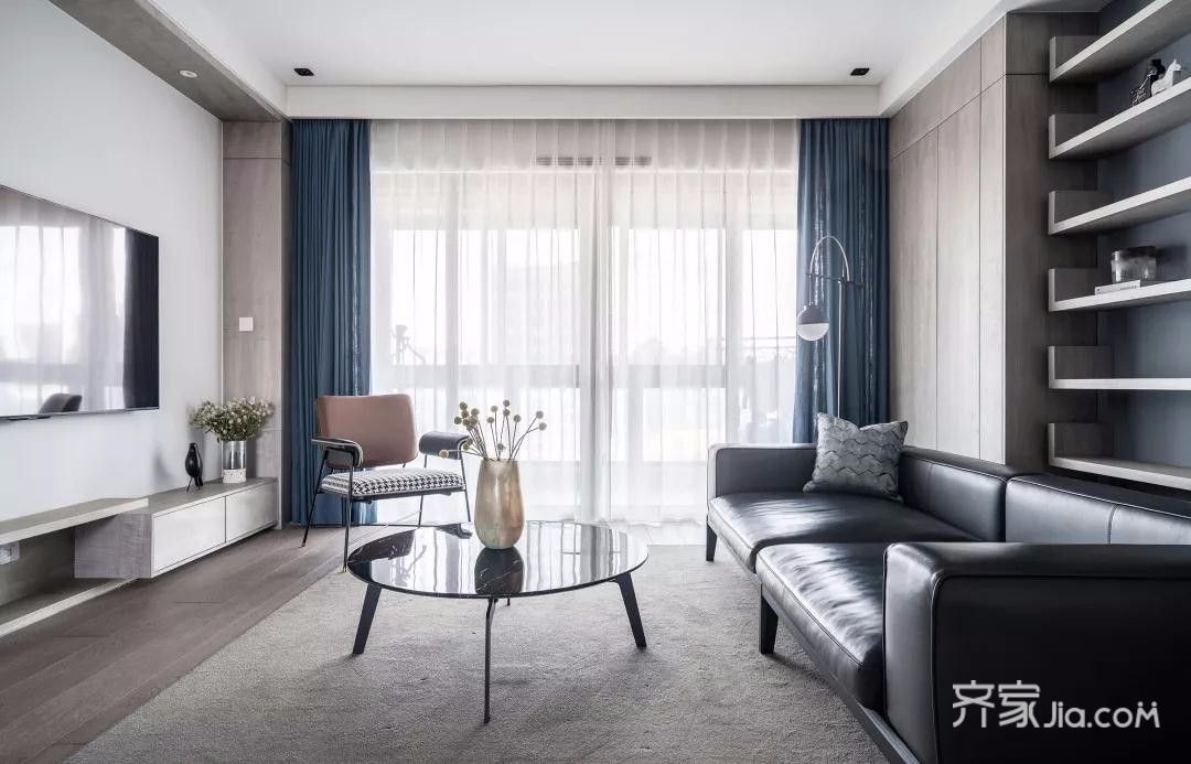 客厅选择干练的黑色和蓝色,搭配温和的木色,让空间看过去简洁、通透。