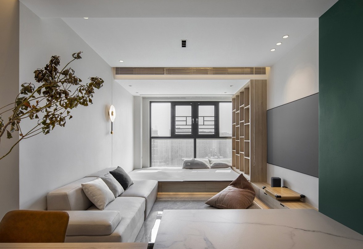 白色的顶面和灰色墙面产生自然的过渡,木纹色正好起到承上启下的作用。偶尔加一味绿色的调料剂,也别有风味。
