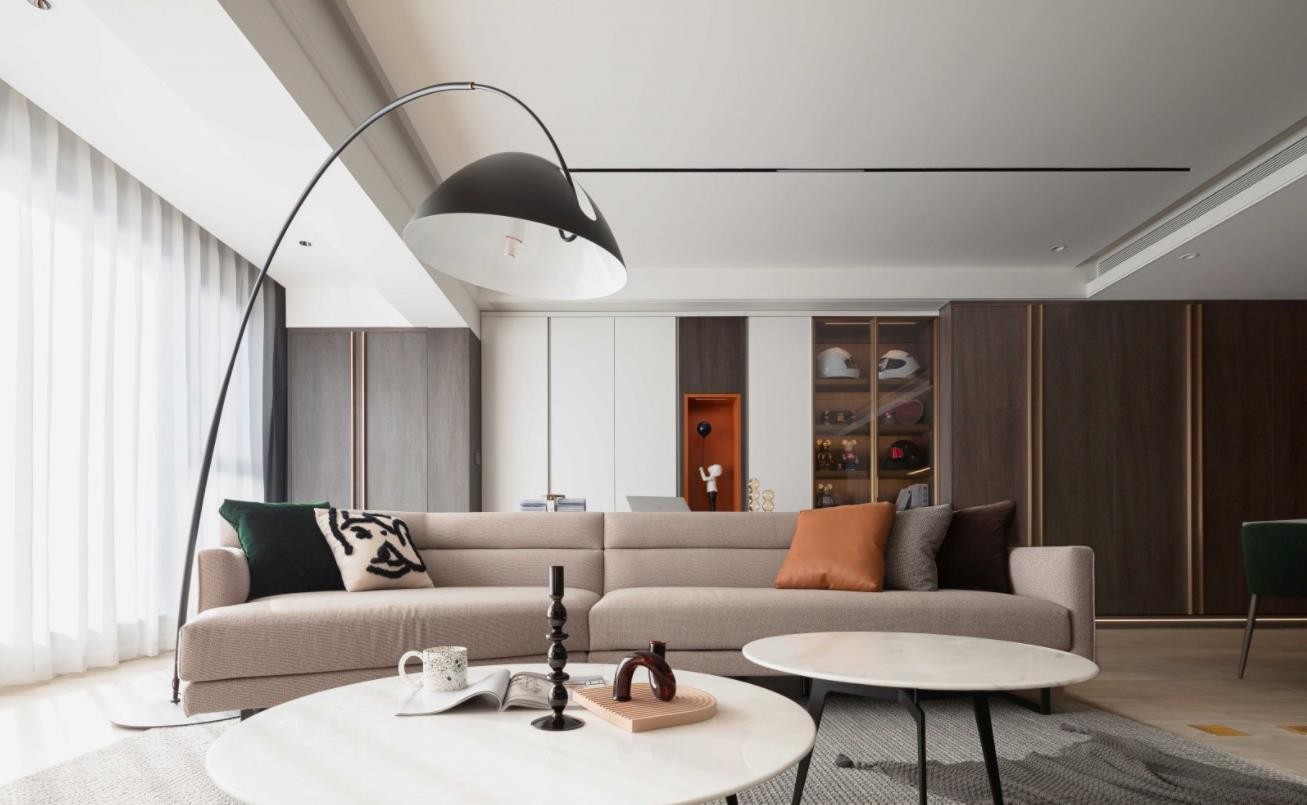沙发背景满面柜子,增加储物功能的同时又点缀了空间